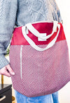 Fabriqué en Espagne ce grand sac est parfait pour l’école, le travail ou comme sac à main. Fait avec une longue bandoulière réglable et deux poignées supérieures moyennes en ruban de coton beige à chevrons. Combiné avec deux tissus différents : un tissu d'ameublement en velours épais de couleur bordeaux sur le dessus et un tissu jacquard épais avec un motif à chevrons bordeaux sur le bas. Fermeture éclair sur le dessus. Entièrement doublé avec un tissu gris épais à l'intérieur. Poches zippées intérieures et extérieures. Peut être porté à l'épaule ou en bandoulière. Pour le garder en bon état, nous recommandons un lavage à la main à l'eau froide et d'éviter le sèche-linge. Idéal pour transporter de nombreux objets tels qu'un ordinateur portable, des cahiers, et plus encore. Très pratique pour le travail, l'université et un usage quotidien.